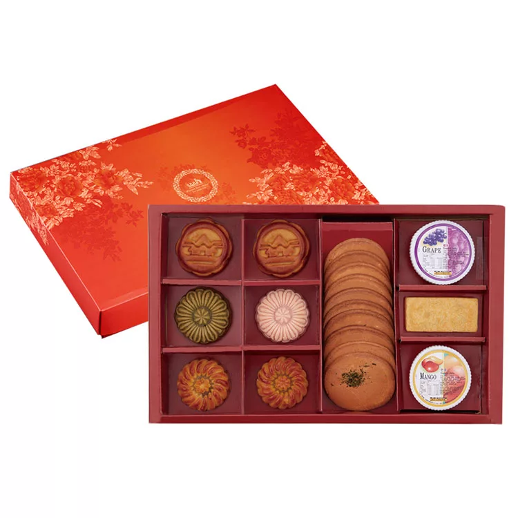 酥香滑緻的獨家廣式口味、純香精細的燒果子系列、酥脆海苔煎餅、酸甜土鳳梨酥和甜蜜Q彈果凍,尊榮風範的優雅禮盒,點綴艷麗牡丹、誠心誠意的送禮好選擇!